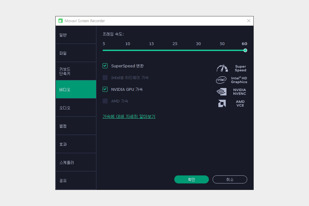 비디오 설정을 살펴보면 PC에 따라서 조금 다르겠지만 인텔과 NVIDIA 그리고 AMD의 가속 기능을 지원하는 것을 확인할 수 있습니다. 모바비 스크린 레코더가 조금 더 원활하게 동작할 수 있도록 도와주는 역할을 합니다.