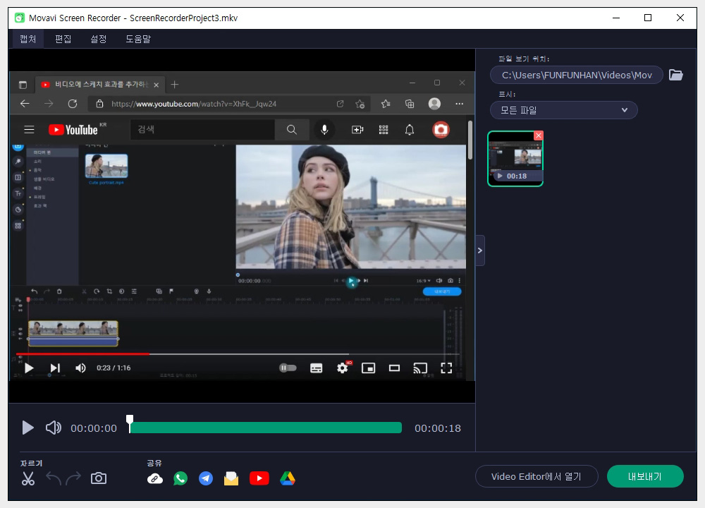 모바비 스크린 레코더로 녹화된 동영상은 간단하게 앞뒤를 자르거나 캡처하고 유튜브 그리고 구글 드라이브로 공유를 할 수 있는 기능이 제공됩니다. 역시 차별화된 특징 중의 하나라고 할 수 있습니다.