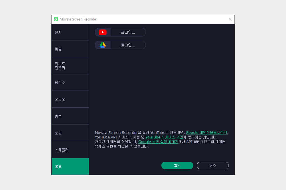 마지막으로 공유에서는 유튜브나 구글 드라이버에 로그인을 해서 모바비 스크린 레코더를 이용해서 녹화된 영상을 공유할 수 있습니다. 필요에 따라서 사용해 주는 것이 좋을 것 같습니다.