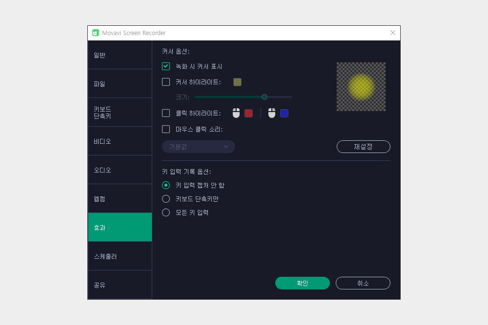 효과에서는 화면을 녹화할 때 커서를 표시할 것인지를 결정할 수 있고 커서와 클릭 하이라이트 색상을 변경할 수 있습니다. 그 외에도 캡처된 영상에 키 입력을 기록할 수 있는 옵션도 준비되어 있습니다.