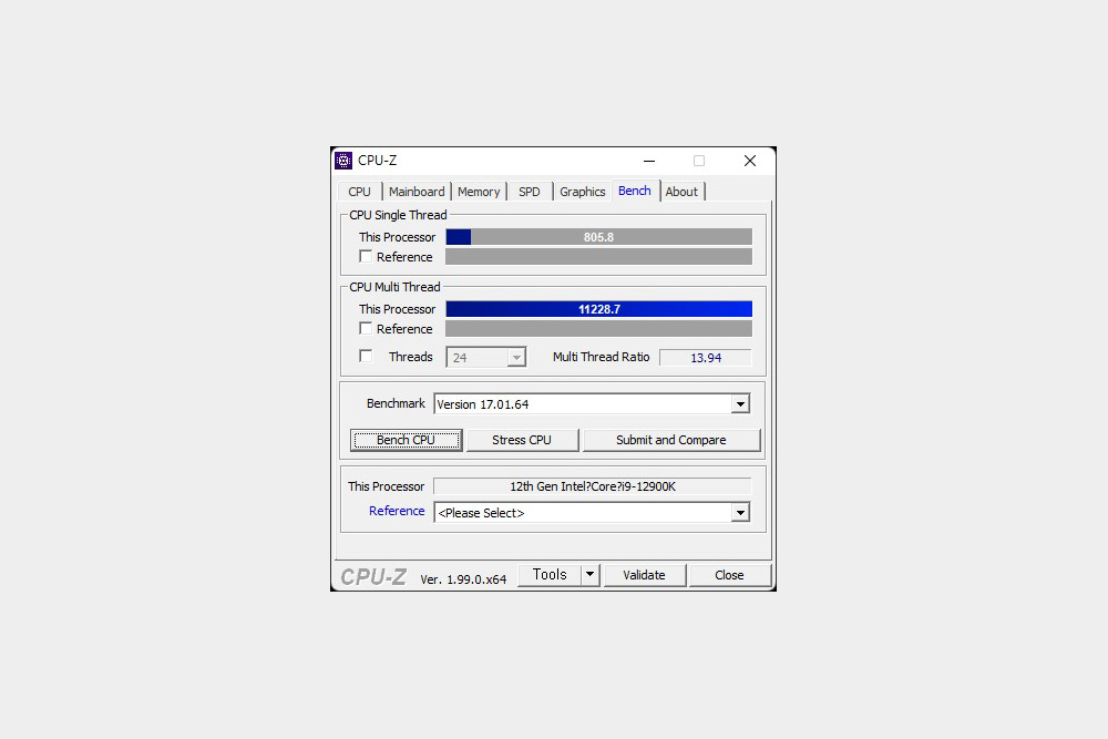 간단한 벤치마크 점수를 확인해 보면 순정 상태에서 CPU-Z의 싱글 코어는 805점 멀티 코어는 11228점이 측정되었습니다. 오버 클럭을 한다면 성능은 더욱 개선될 것으로 예상합니다.