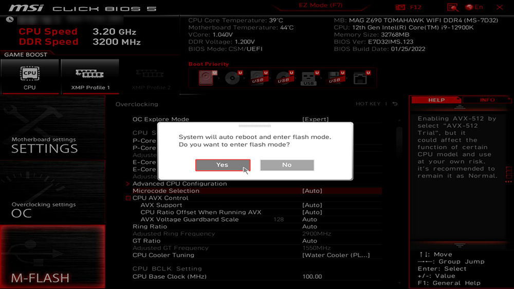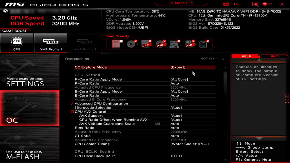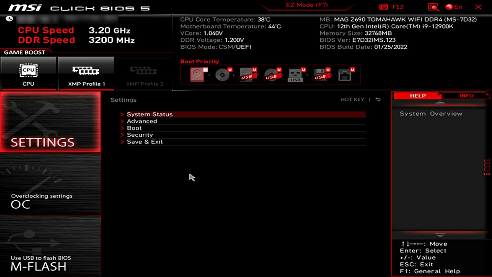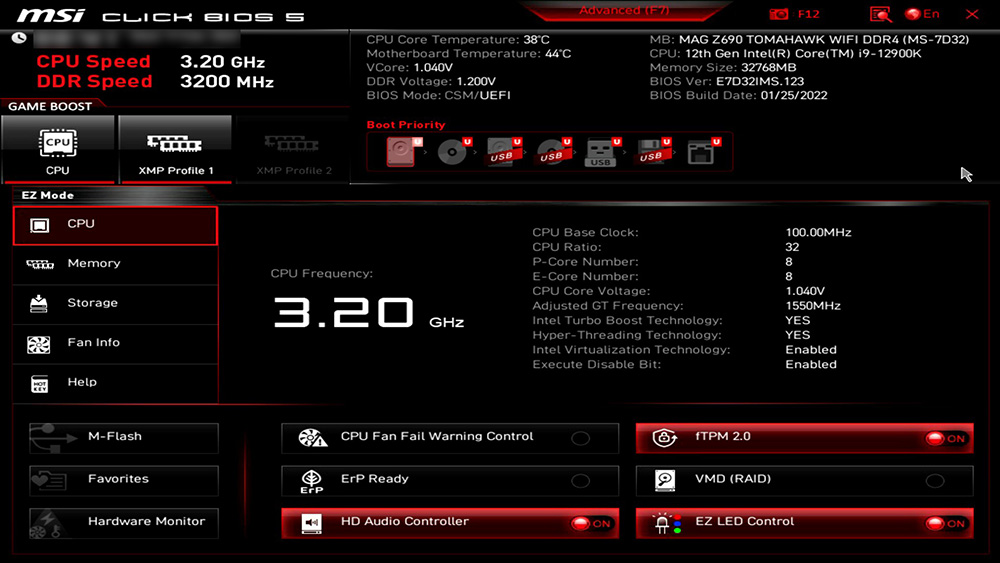 MSI Z690 토마호크 WIFI DDR4 메인보드는 부팅할 때 DEL키를 눌러서 바이오스에 진입할 수 있습니다. EZ모드에서는 현재 상태를 한눈에 확인할 수 있도록 디자인되었습니다. 참고로 최신 바이오스 버전은 2022년 1월 25일에 공개된 7D32v123(Beta version)입니다.