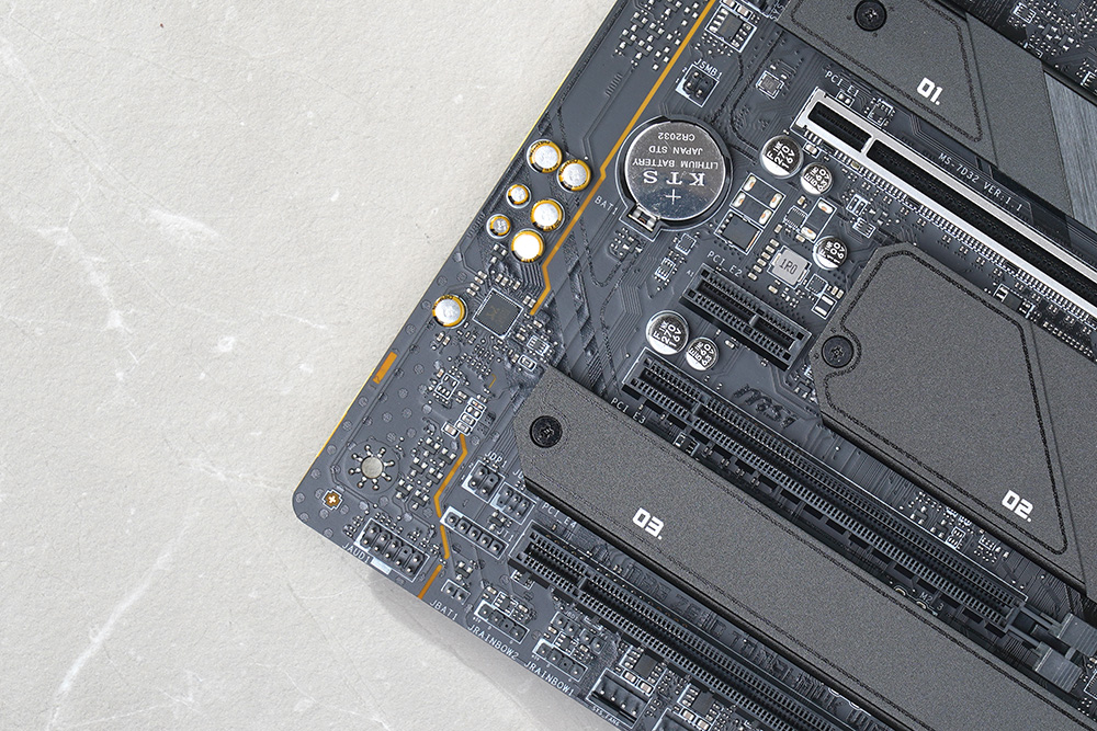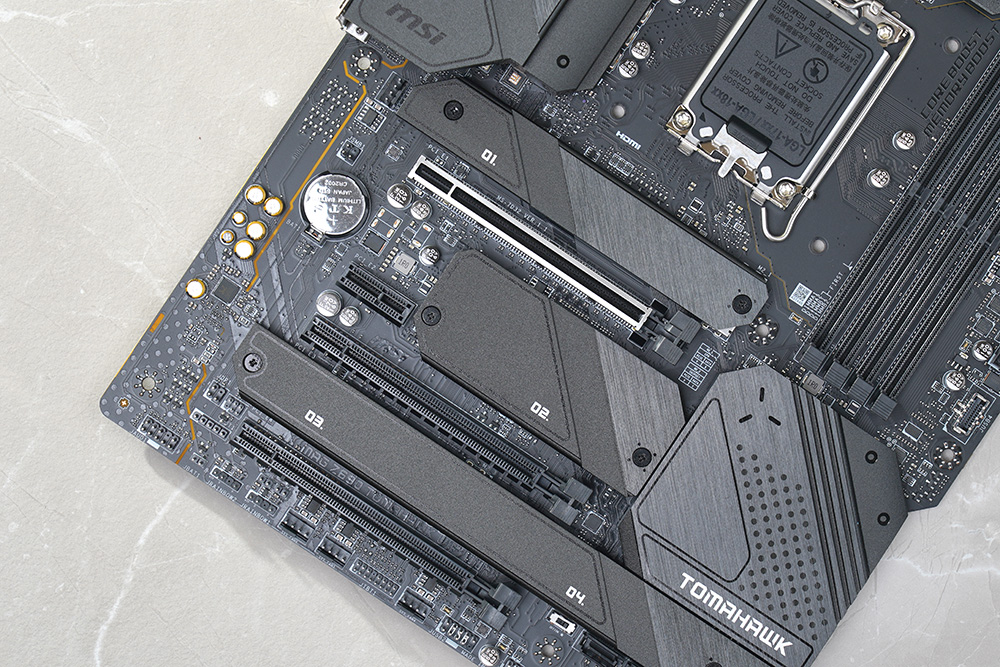 MSI Z690 토마호크 WIFI DDR4 메인보드에는 4개의 M.2 NVMe SSD를 장착할 수 있습니다. 참고로 1, 2, 4번은 PCIe 4.0 x4를 지원하고 3번만 PCIe 3.0 x4입니다. 그리고 그래픽카드를 장착할 수 있는 PCIe 슬롯에는 내구성을 높여주는 스틸아머가 적용되었습니다.