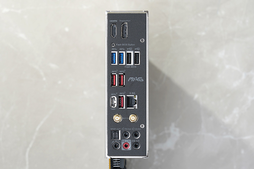 후면 I/O 포트를 확인해 보면 DP와 HDMI 그리고 플래시 바이오스 버튼과 USB 3.2 Gen 2 포트, 2.5Gbps 랜 등이 탑재되었습니다. 참고로 MSI Z690 토마호크 WIFI DDR4 메인보드는 인텔 AX201 와이파이6 칩셋이 탑재되었고 안테나를 장착할 수 있는 커넥터도 준비되어 있습니다.