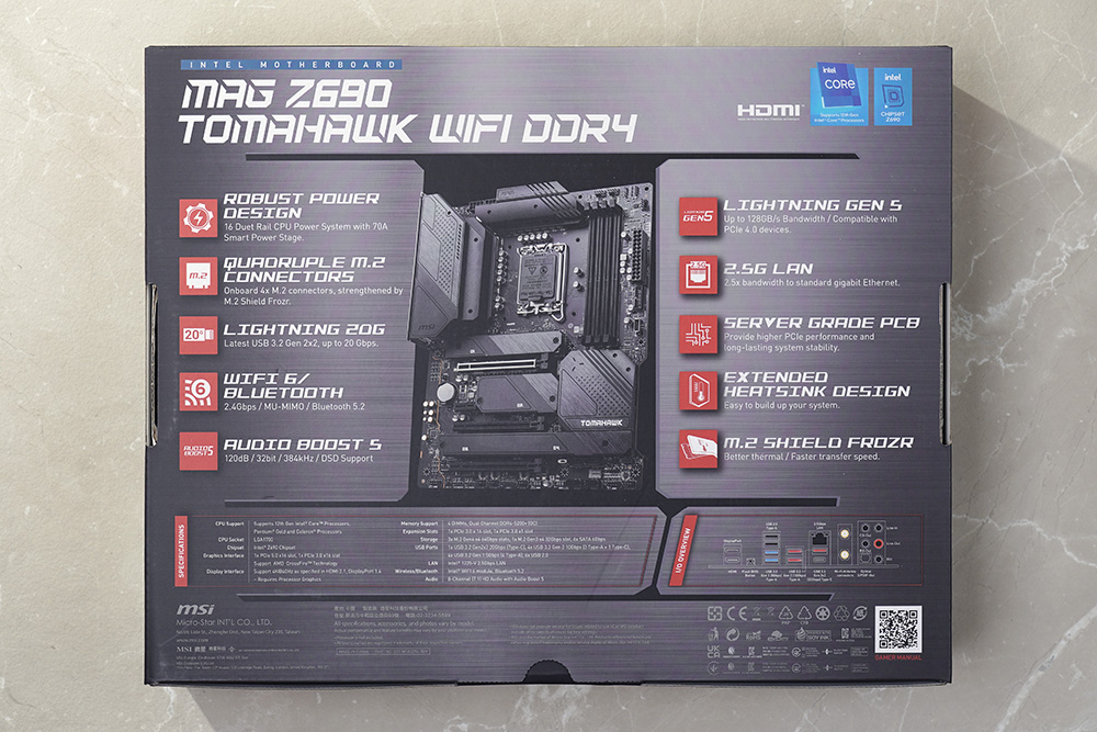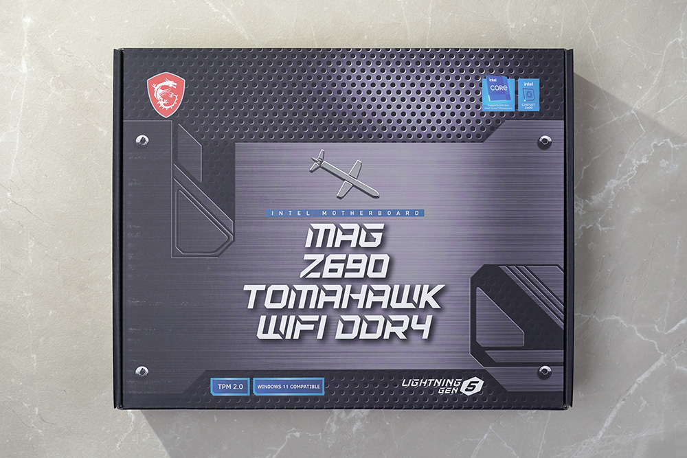 MSI Z690 토마호크 WIFI DDR4 메인보드의 박스는 세련된 스타일로 디자인되었습니다. 그리고 아래를 살펴보면 윈도우 11에 필수적인 TPM 2.0을 지원한다는 문구가 표시되어 있습니다. 참고로 12세대 인텔 프로세서를 사용하려는 분들은 스케줄러 문제로 윈도우 10보다는 윈도우 11을 설치해서 사용하는 것을 추천합니다.
