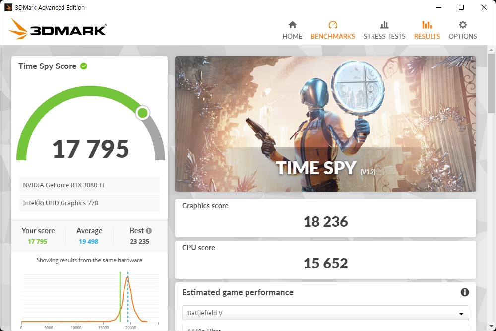 12세대 인텔 i9-12900K와 엔비디아 지포스 RTX 3080 Ti의 성능을 Time Spy를 통해서 확인해 보면 17,795점이 측정되었습니다. 참고로 그래픽 스코어는 18,236점을 보여주었습니다.