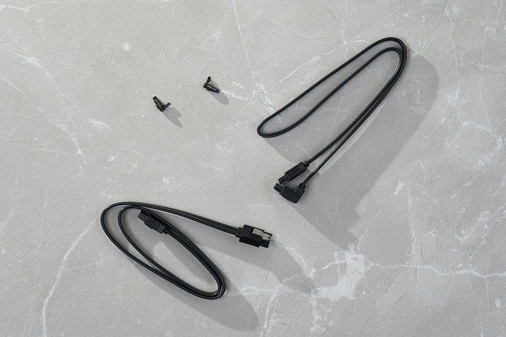 마지막으로 2개의 EZ M.2 클립과 역시 2개의 SATA 케이블도 구성품에 포함되어 있습니다. 특히 SATA 케이블의 커넥터 형태가 하나는 기역 형태로 제작되어서 있어서 케이스의 구조에 따라서 장착할 수 있습니다.