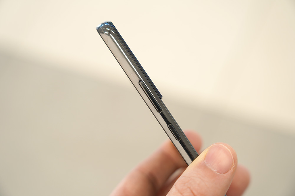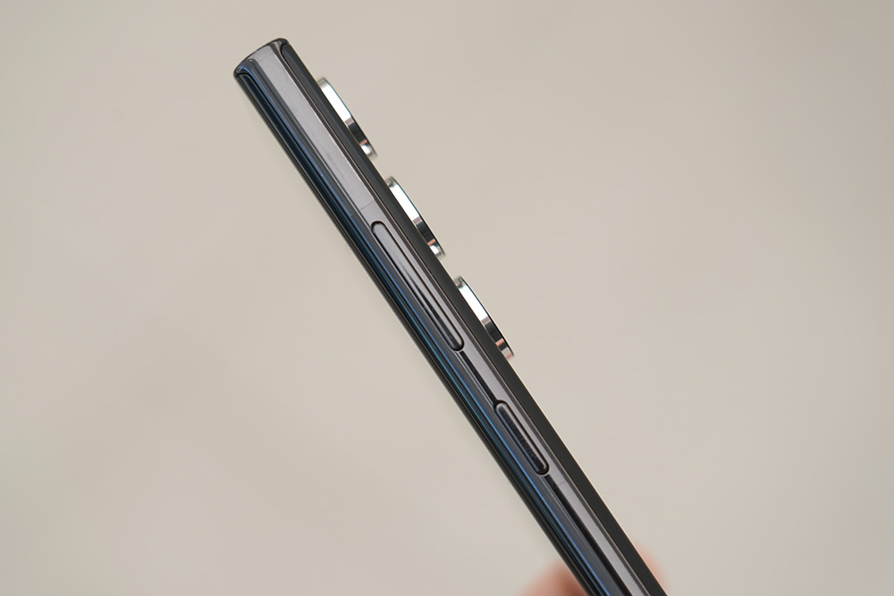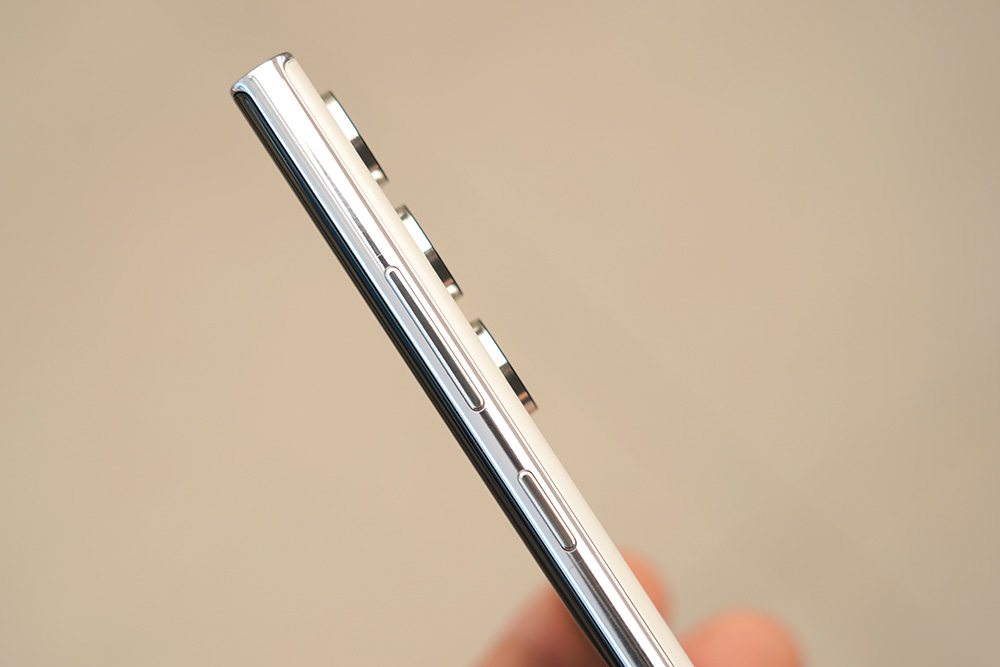 갤럭시 S22 울트라의 팬텀 화이트 색상 역시도 무난한 느낌을 주는 편입니다. 그리고 옆쪽을 살펴보면 갤럭시 S22의 기본 모델들과는 다르게 커브드 디스플레이가 적용된 것을 확인할 수 있습니다. 그립감 부분에서는 장점이 있지만 저는 좋아하지 않는 형태입니다.