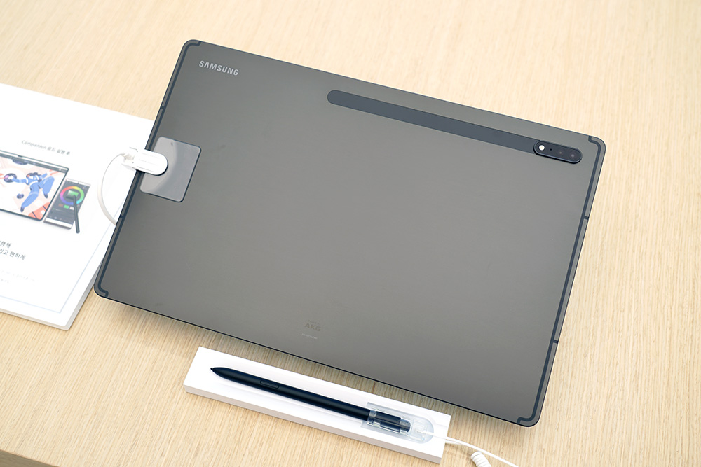 갤럭시 탭 S8 울트라의 후면에는 1,300만 화소의 카메라와 699만 화소의 초광각 그리고 LED 플래시가 탑재되었습니다. 구색만 맞추었다는 느낌을 받았습니다. 그리고 옆쪽에 S펜을 부착해 놓을 수 있습니다. 참고로 배터리 용량은 11,2000mAh입니다.