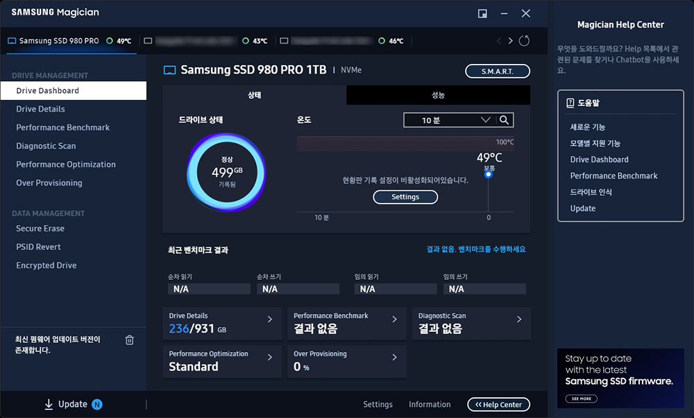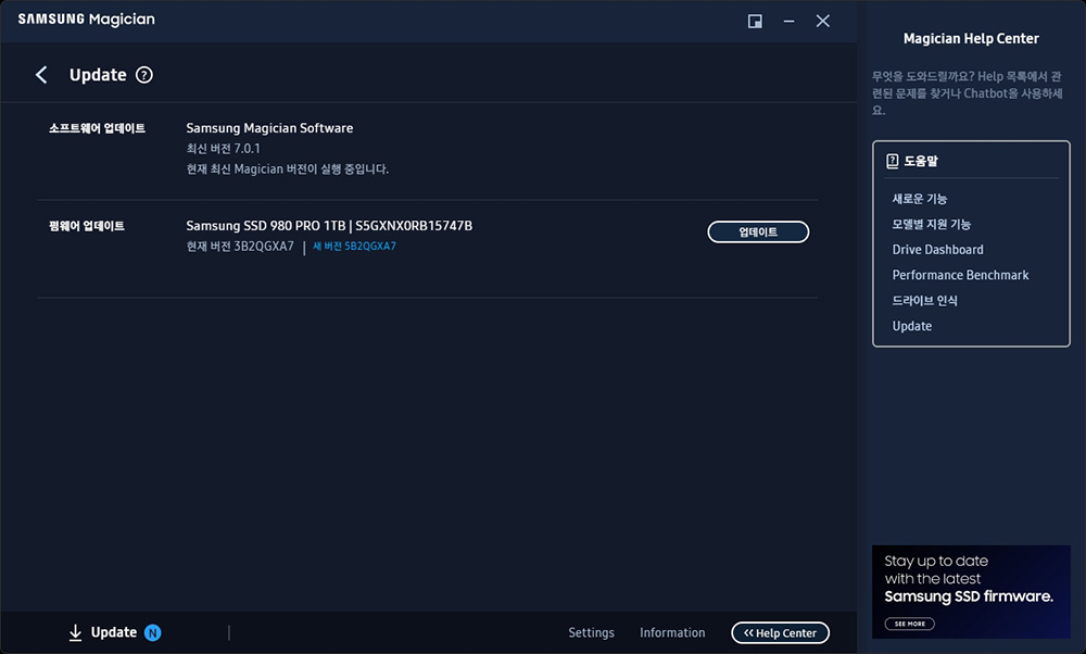 다운로드 받은 삼성 매지션 소프트웨어를 설치하고 실행하면 왼쪽 아래에 최신 펌웨어 업데이트 버전이 존재합니다. 라는 문구가 표시된 것을 확인할 수 있습니다, 제가 사용해 본 SSD 관리 프로그램 중에서는 가장 편리한 축에 속합니다.