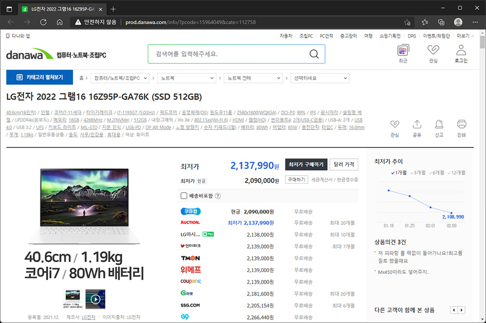 제가 가장 추천하는 제품 중의 하나는 LG전자 2022 그램16 16Z95P-GA76K입니다. 프로세서의 일정 때문에 12세대 인텔 제품이 탑재되지 않았다는 점은 아쉽지만 16인치 노트북임에도 불구하고 무게가 1.19kg이라서 휴대성을 중요하게 생각하는 분들에게 유용합니다. 그리고 한 가지 팁을 드리자면 LPDDR4x 메모리는 온보드되어 있어서 나중에 따로 업그레이드할 수 없으니 가능하면 16GB 용량의 제품을 구매하는 것이 좋습니다.
