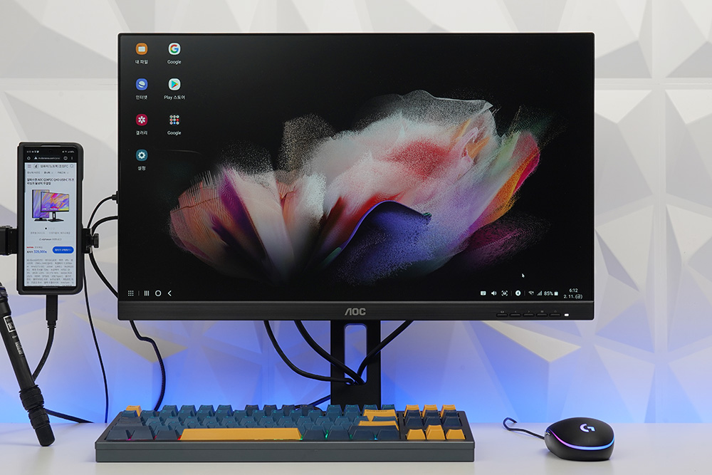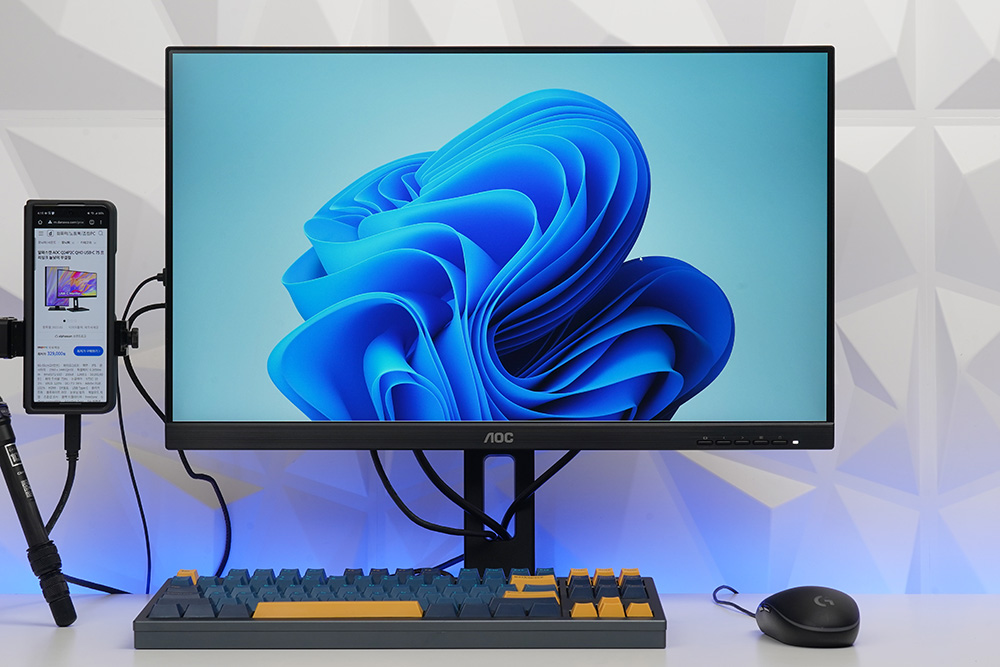 알파스캔 AOC Q24P2C USB-C 모니터에는 KVM 스위치 기능이 탑재되었습니다. 그래서 모니터에 키보드와 마우스를 연결하면 데스크톱이나 노트북 혹은 스마트폰을 번갈아 가면서 사용할 수 있습니다. (입력신호 버튼으로 간단하게 전환할 수 있고 데스크톱에는 별도의 USB 케이블을 연결해야 합니다.)
