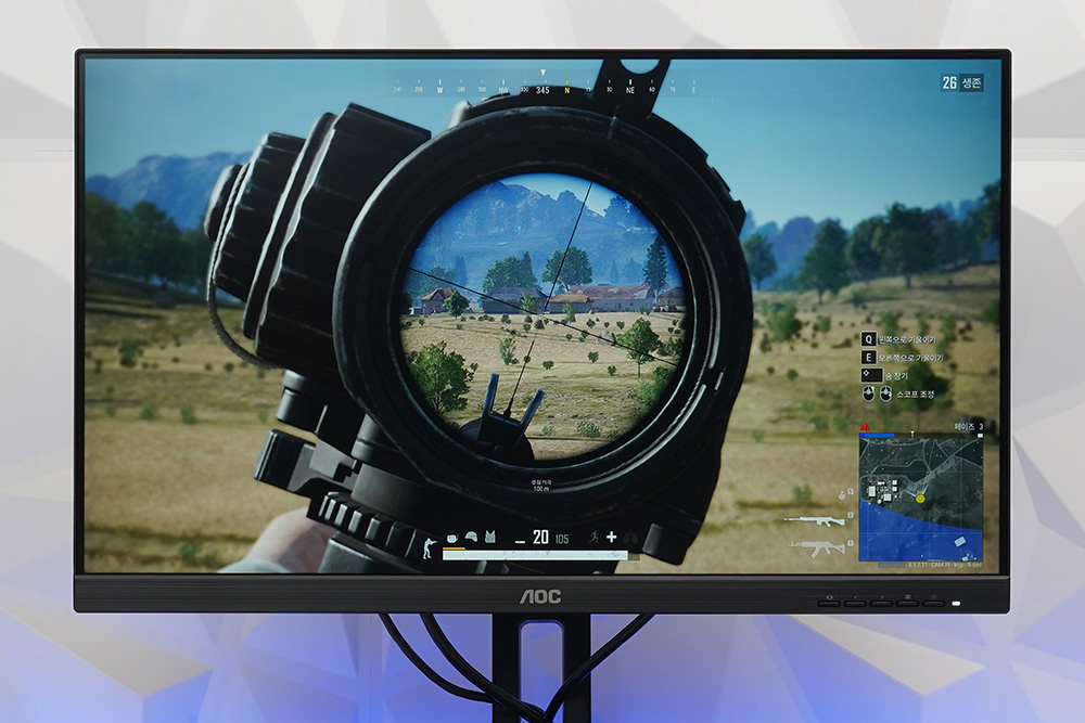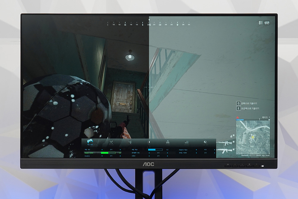 알파스캔 AOC Q24P2C USB-C 모니터의 게임 설정을 살펴보면 우선 섀도우 컨트롤 기능을 이용해서 화면의 밝기를 조절할 수 있습니다. (좌:50, 우:100) 그리고 조금 더 빠르게 적을 찾아낼 수 있습니다.