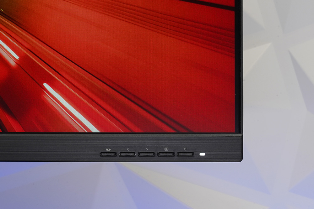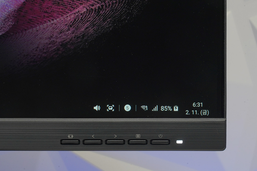 전면의 오른쪽 아래를 확인해 보면 바로 가기 키가 배치되어 있습니다. 왼쪽부터 입력신호 / 나가기, 좌(<), 우(>), 메뉴 / 시작하기, 전원으로 구성되어 있습니다. 그 외에도 상태를 확인할 수 있는 LED도 탑재되었습니다.