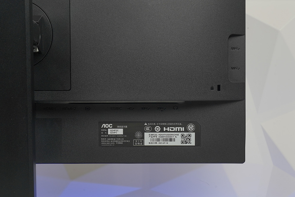 알파스캔 AOC Q24P2C USB-C 모니터의 뒷면은 깔끔한 스타일로 디자인되었습니다. 차분한 느낌을 주는 편이어서 가정에서는 물론이고 사무실에서 사용해도 크게 부담스럽지 않습니다.