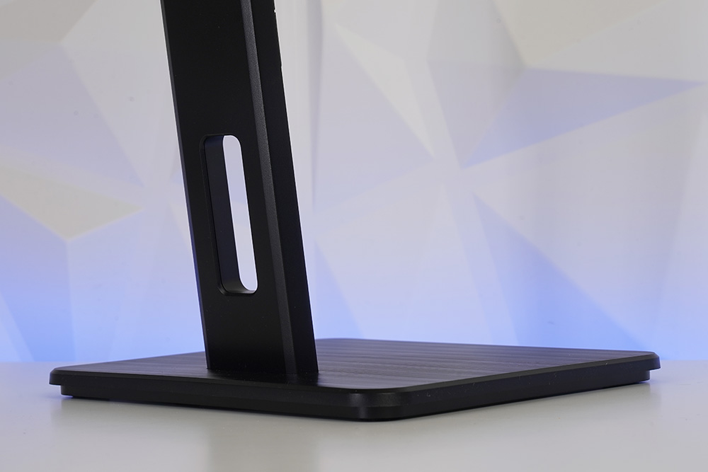 다기능 스탠드의 뒤쪽에는 구멍이 뚫려 있어서 케이블을 조금 더 깔끔하게 정리할 수 있도록 도와주는 역할을 합니다. 그리고 스탠드의 상판은 헤어라인 마감이 적용되었고 깔끔한 느낌을 주는 편입니다.