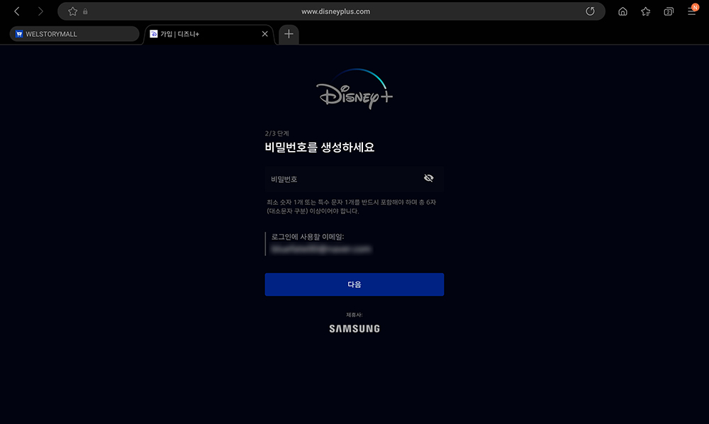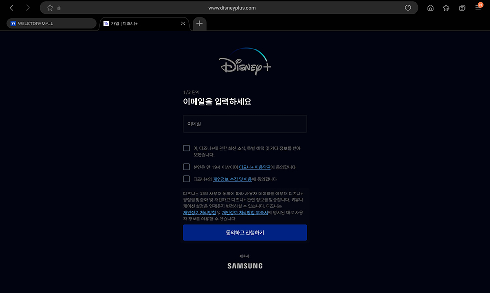 다음에는 디즈니+에 가입을 해주어야 합니다. 우선 이메일과 비밀번호를 입력해야 하고 아래쪽에 최신 소식 관련 체크를 하면 여러 가지 귀찮은 메일이 올 수 있으니 필수정보만 체크하시길 바랍니다.
