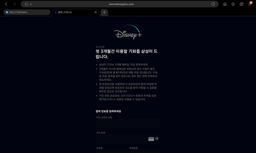 이용권을 이용해서 등록했기 때문에 첫 3개월간 이용할 기회를 삼성이 드립니다.라는 문구가 표시되고 다음에는 결제 정보를 입력해야 합니다. 이때 자신이 사용하는 카드에 100원이 결제되고 바로 취소됩니다. 제대로 결제가 되는지 확인하기 위함입니다.