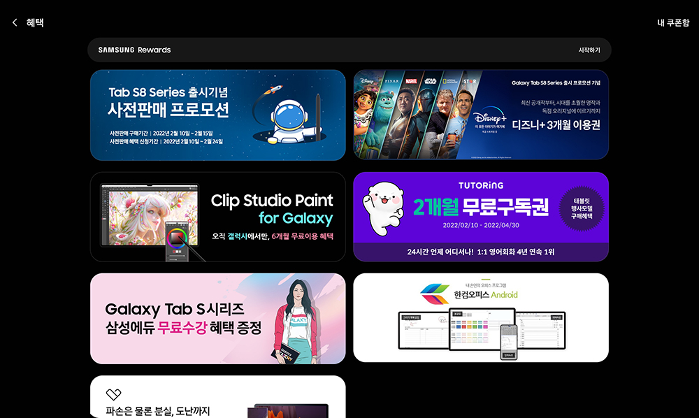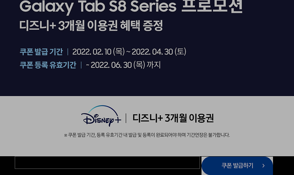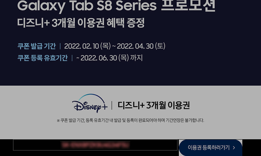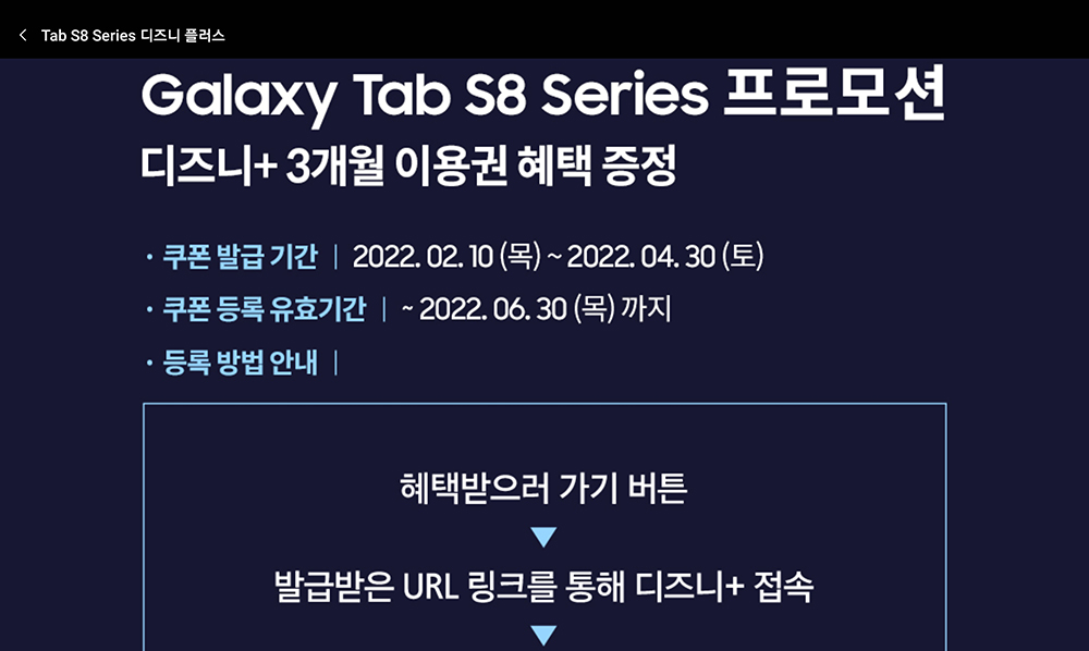 Galaxy Tab S8 Series 프로모션 내용을 확인해 보면 쿠폰 발급 기간은 2022년 2월 10일부터 4월 30일까지이고 쿠폰 등록 유효기간은 6월 30일까지입니다. 가끔 잊어버리는 경우가 종종 있으니 생각났을 때 등록을 하시길 바랍니다.