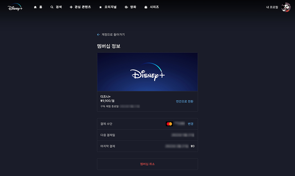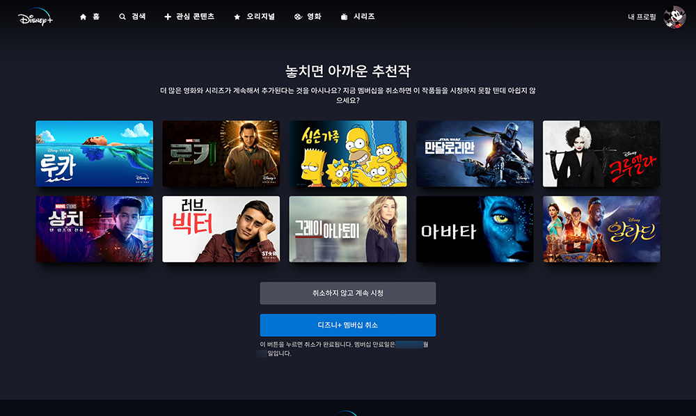 다음에는 멤버십 정보에서 맨 아래쪽에 배치된 멤버십 취소를 선택해주면 디즈니+의 멥버십이 취소됩니다. 그리고 여기에서도 멤버십이 종료되는 날짜를 확인할 수 있습니다.