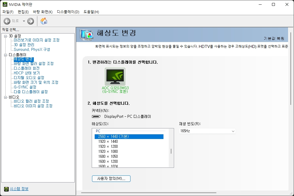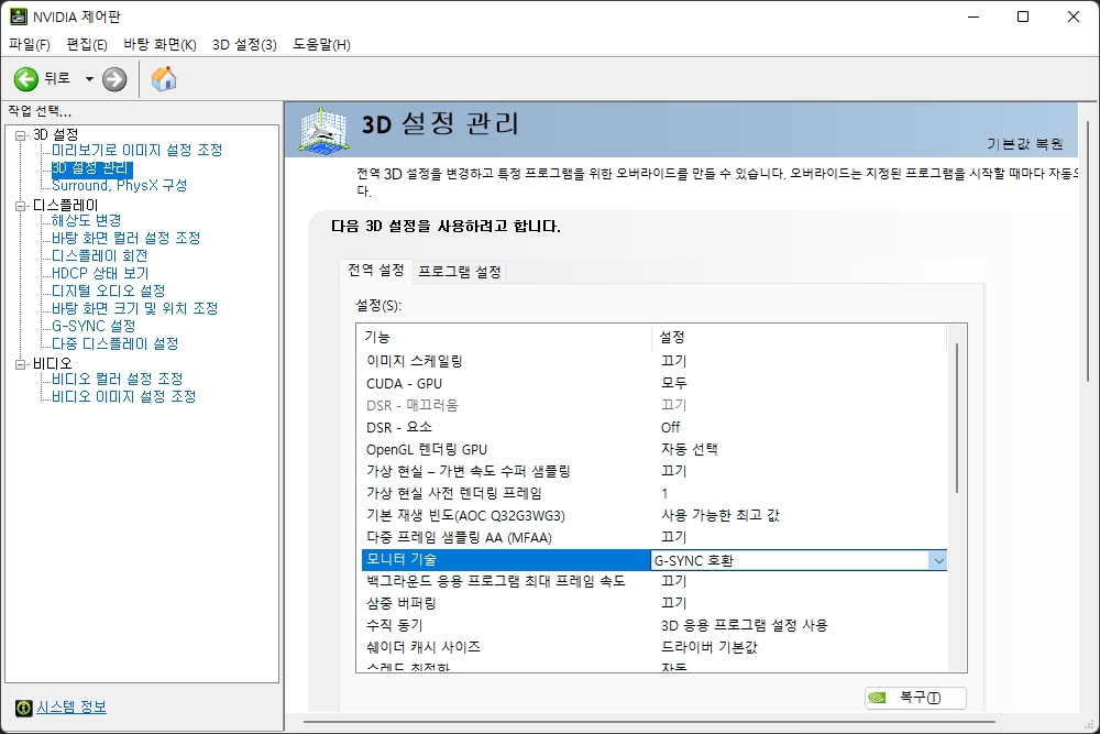 엔비디아 그래픽카드 기준으로 설명하면 NVIDIA 제어판에서 G-SYNC 호환 활성화를 켜주어야 합니다. 그리고 3D 설정에서 모니터 기술을 G-SYNC 호환으로 변경해주면 됩니다. 참고로 잠시 후에 확인해 볼 OSD에서 Adaptive-Sync 기능을 켜 놓아야 합니다.
