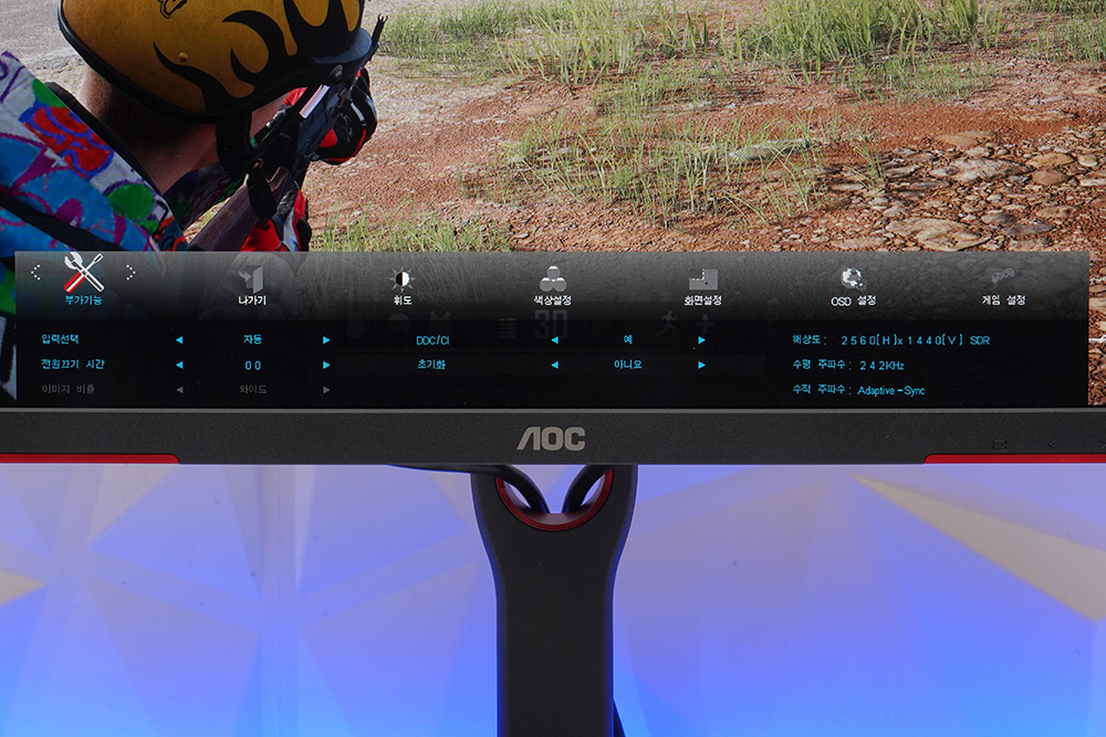 부가 기능에서는 입력 선택과 초기화와 같은 기능을 사용할 수 있습니다. 그리고 AMD 프리싱크 프리미엄과 NVIDIA 지싱크 호환 기능이 제대로 동작하면 수직 주파수가 Adaptive-Sync 되어 있다는 문구를 확인할 수 있습니다.
