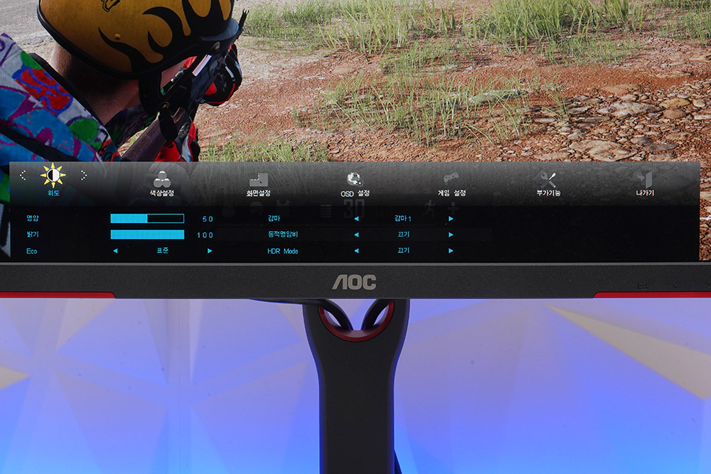 알파스캔 AOC Q32G3S 게이밍 모니터의 OSD를 확인해 보면 우선 휘도에서는 명암이나 밝기 드리고 Eco 기능을 설정할 수 있습니다. 참고로 최대 밝기는 250cm/m2입니다.