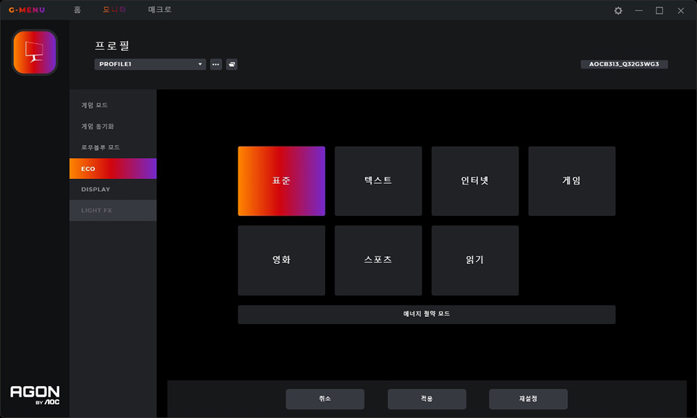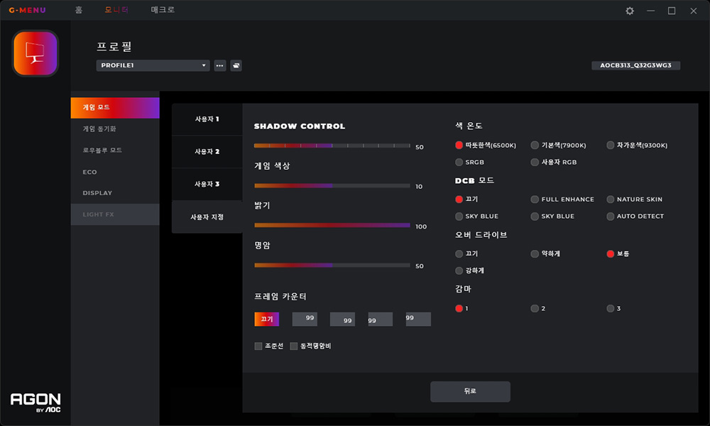 게임 설정에서는 게임 모드나 섀도우 컨트롤 그리고 로우블루 모드 등을 변경할 수 있습니다. 자신이 플레이하는 게임의 종류에 따라서 해당 기능들을 활용해주는 것이 좋을 것 같습니다.