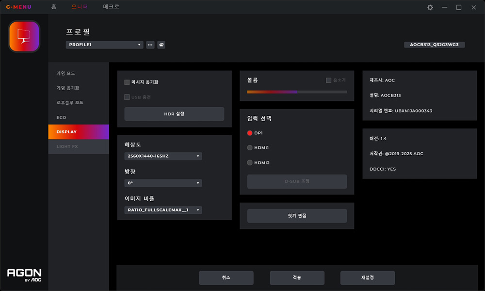 알파스캔 AOC Q32G3S 게이밍 모니터는 G-MENU라는 소프트웨어를 통해서 OSD 없이도 일부 기능들을 제어할 수 있습니다. 바로바로 설정을 변경할 수 있다는 점이 편리한 부분입니다.
