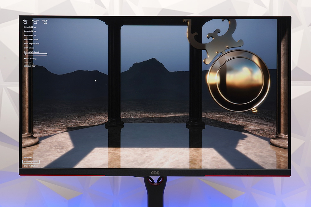실제로 G-SYNC Pendulum Demo라는 프로그램을 통해서 알파스캔 AOC Q32G3S 게이밍 모니터의 NVIDIA 지싱크 호환 기능을 살펴보면 해당 기술을 사용하지 않은 오른쪽 화면에서 미세하게 끊어짐이 발생하는 것을 확인할 수 있습니다.