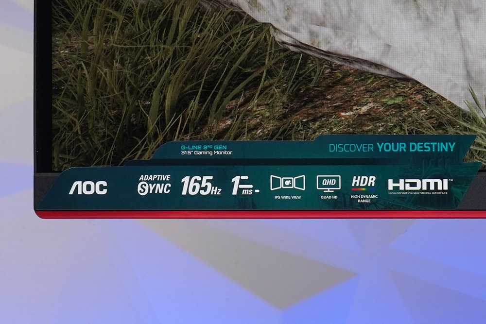 디스플레이의 왼쪽 아래에는 알파스캔 AOC Q32G3S 게이밍 모니터의 주요 특징이 설명되어 있습니다. 주목해 보아야 할 부분은 AMD 프리싱크 프리미엄과 NVIDIA 지싱크 호환을 지원한다는 점입니다. 그래서 화면이 끊어지는 것을 어느 정도 방지할 수 있습니다.