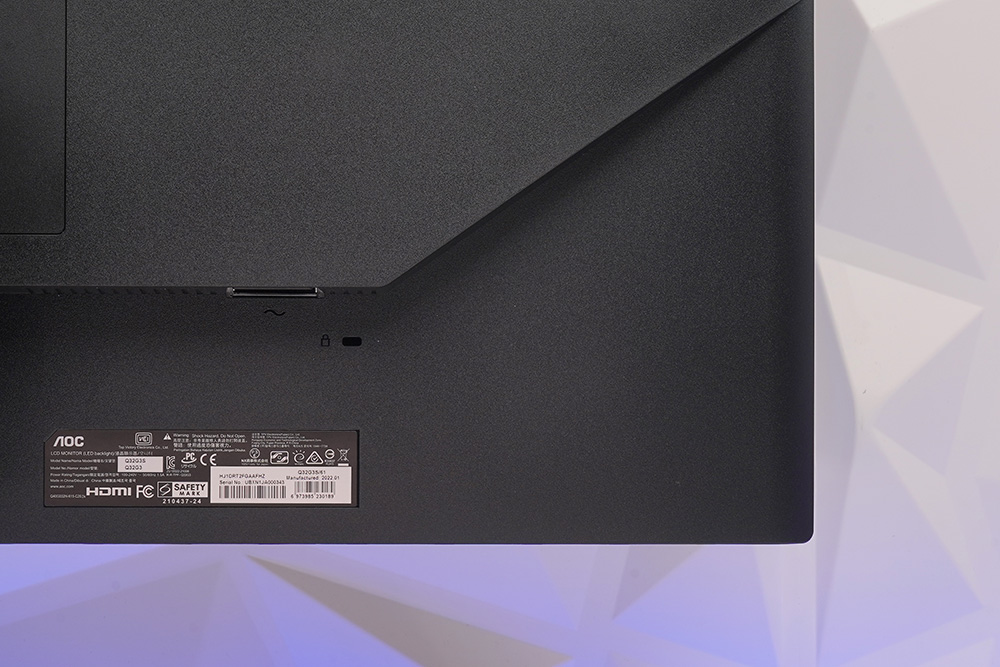 뒷면의 오른쪽 아래를 확인해 보면 켄싱턴락 홈이 준비되어 있습니다. 알파스캔 AOC Q32G3S 게이밍 모니터를 개방된 공간에 설치하려는 분들은 잠금장치 연결해 놓는 것이 좋을 것 같습니다.