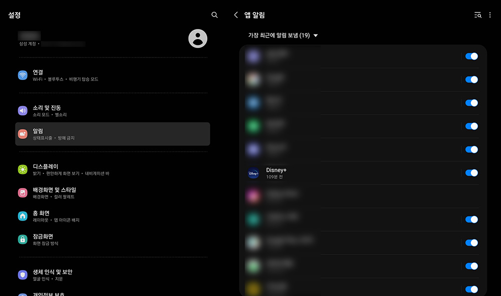 그래서 인터넷을 검색해 보니 디즈니+ 앱에서는 알림을 차단하는 기능이 없고 스마트폰이나 태블릿의 알림에서 해당 앱의 일람을 꺼주어야 한다는 내용을 확인할 수 있었습니다. 삼성 제품 기준으로 스위치를 변경해 주면 됩니다.