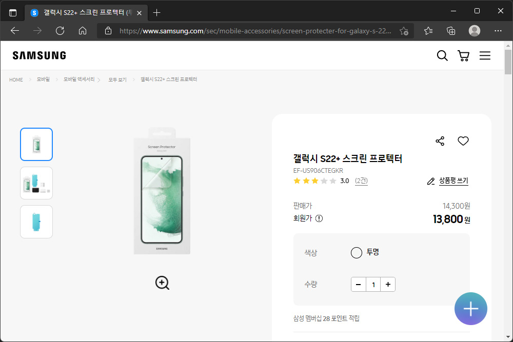 갤럭시 S22 스크린 프로텍터의 가격은 14,300원으로 판매되었고 회원가는 13,800원입니다. 그리고 높은 터치 감도를 제공하기 위해서 특수하게 제작되었고 지문 인식 센서와도 호환성이 좋다고 합니다.