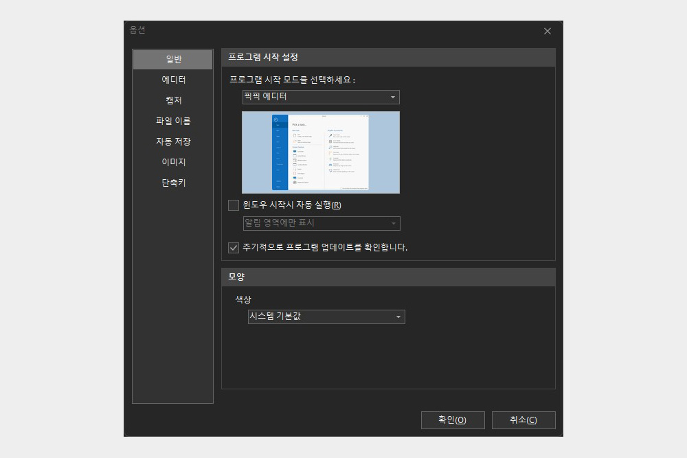 픽픽 (PicPick) 6.0의 설정을 확인해 보면 프로그램 시작 모드를 변경할 수 있고 자동 실행 기능도 지원합니다. 필요에 따라서 활용해주는 것이 좋을 것 같습니다. 참고로 업데이트 알림 같은 경우에는 라이센스 문제가 혹시나 생길 수 있으니 공지를 항상 잘 확인하시길 바랍니다.