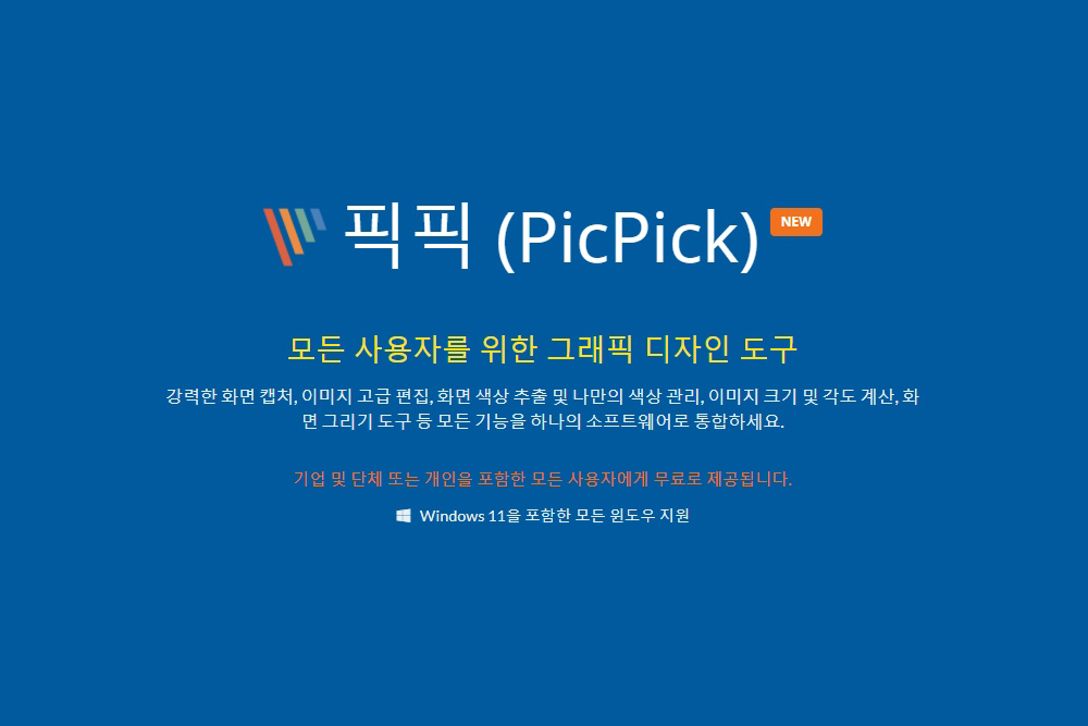픽픽 (PicPick) 6.0은 아래쪽에 있는 링크의 홈페이지에서 다운로드 받을 수 있습니다. 주목해보아야 할 부분은 기업 및 단체 그리고 개인을 포함함 모든 사용자에게 무료로 제공된다는 점입니다. 그렇지만 예전에 자동 업데이트 기능을 이용해서 약관을 변경해서 문제가 된 적이 있는 소프트웨어도 존재하기 때문에 가끔 확인해 보아야 합니다.