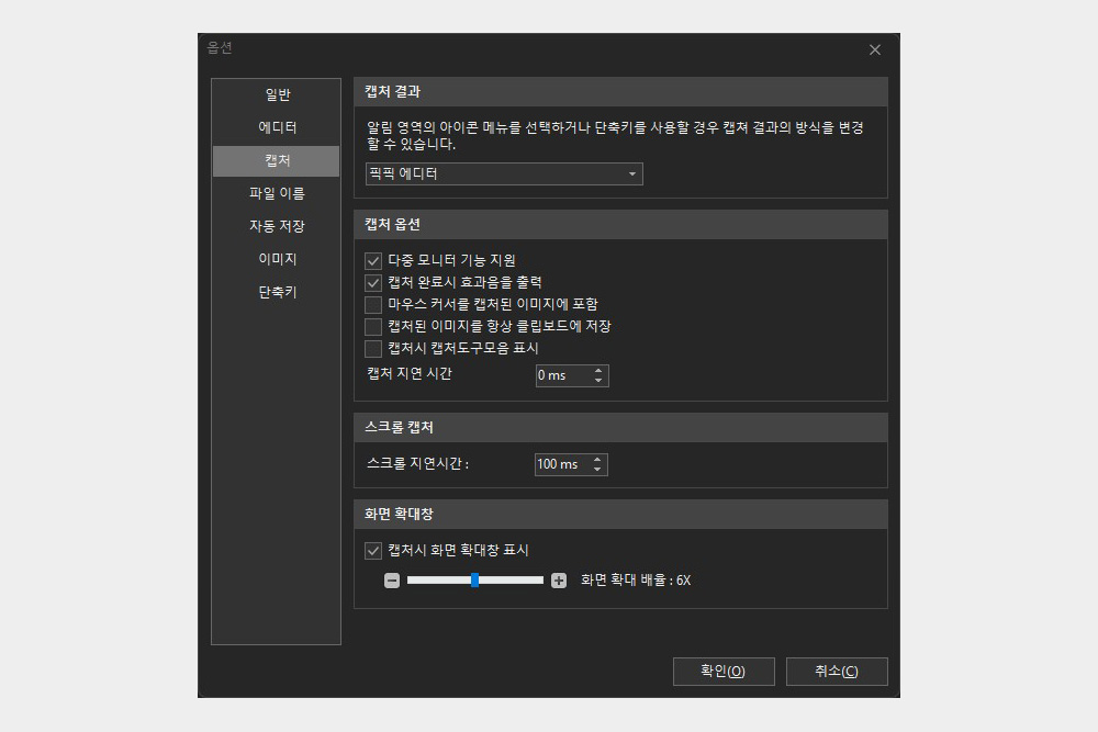 캡처에서는 캡처 후에 픽픽 에디터를 실행하거나 다중 모니터 기능 지원 그리고 캡처 완료 후 효과음 출력을 할 수 있습니다. 그리고 캡처 지연 시간을 이용해서 조금 더 동적인 상황에 대처할 수 있습니다.