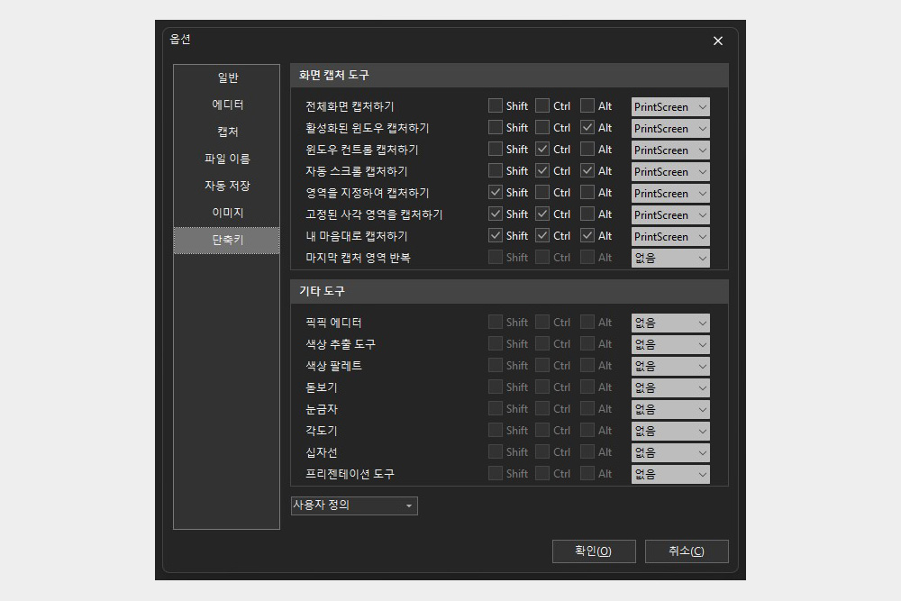 이미지에서는 JPEG 화질을 설정할 수 있습니다. 저는 가능하면 95 ~ 100으로 세팅하는 것을 추천하고 단축키도 다양한 옵션들이 준비되어 있어서 활용도가 높은 편입니다. 그리고 원 드라이브와 같은 프로그램과 단축키가 겹칠 수 있는데요. 이런 경우에는 하나의 프로그램에서 해제를 해주어야 합니다.