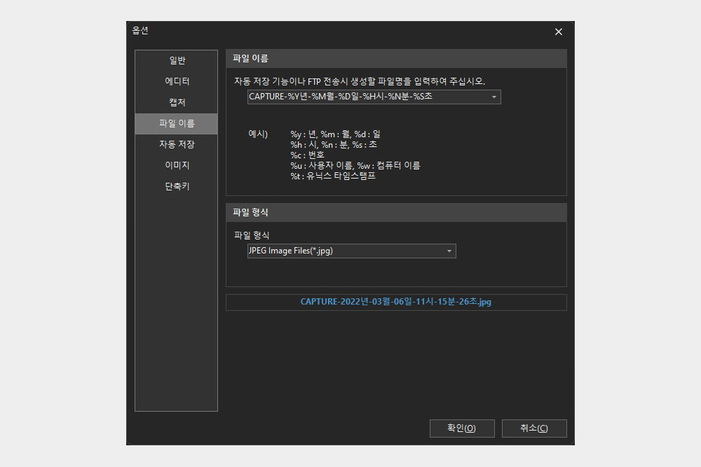 파일 이름의 경우에는 다양한 변수들을 이용해서 자동으로 캡처된 시간이 파일으로 저장되도록 할 수 있습니다. 저는 %Y년-%M월-%D일-%H시-%N분-%S초 이렇게 설정하는 것을 추천합니다. 그리고 파일 형식은 JPG나 PNG 등으로 변경할 수 있습니다.