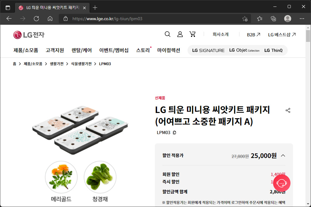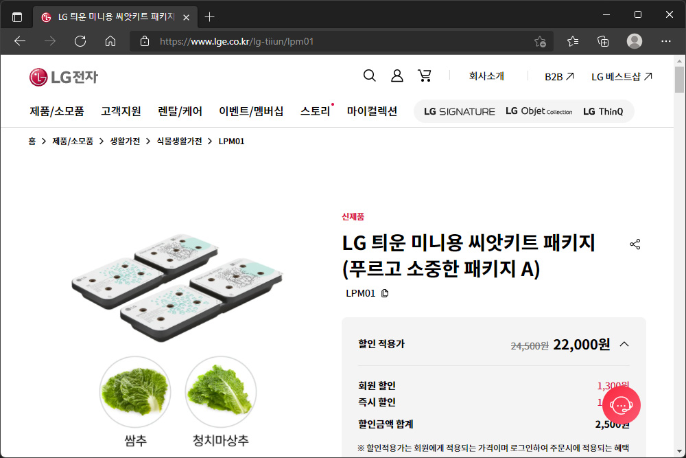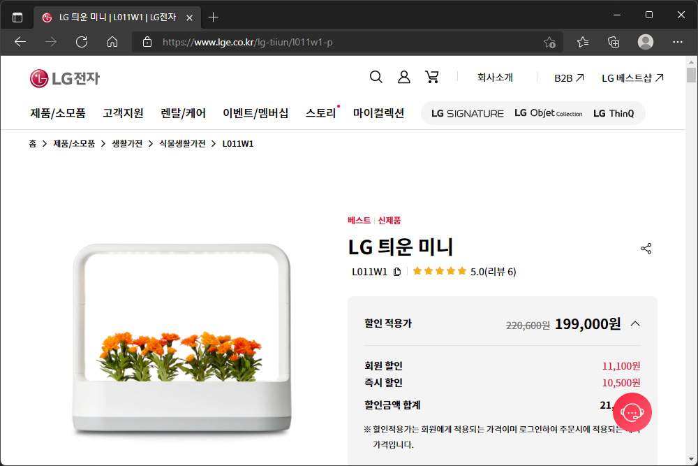 LG 틔운 미니의 가격은 220,600원(할인적용가 199,000원)입니다. 재미있는 인테리어 소품 겸 채소를 직접 키워서 먹을 수 있다는 점을 생각해 보면 부담이 되는 편은 아니라고 판단되었습니다.
