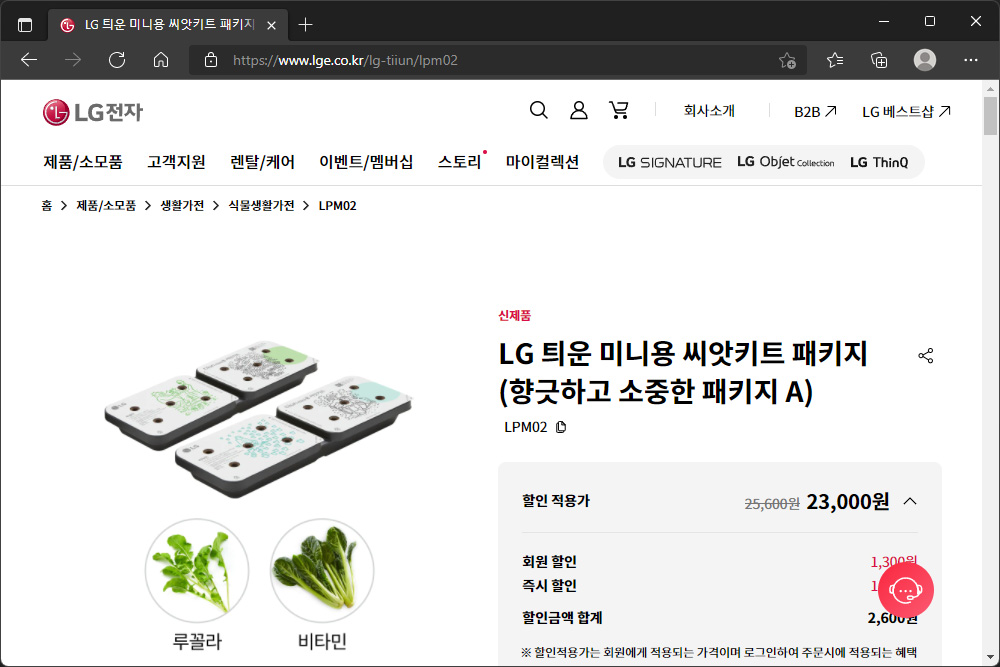 LG 틔운 미니의 가격은 220,600원(할인적용가 199,000원)입니다. 재미있는 인테리어 소품 겸 채소를 직접 키워서 먹을 수 있다는 점을 생각해 보면 부담이 되는 편은 아니라고 판단되었습니다.