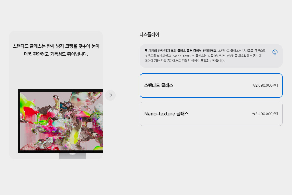 애플 스튜디오 디스플레이의 가격은 스탠다드 글래스는 2,090,000원이고 나노 텍스처 글래스는 2,490,000원입니다. 그리고 기울기 및 높이 조절 스탠드로 변경하면 54만원이 추가됩니다.