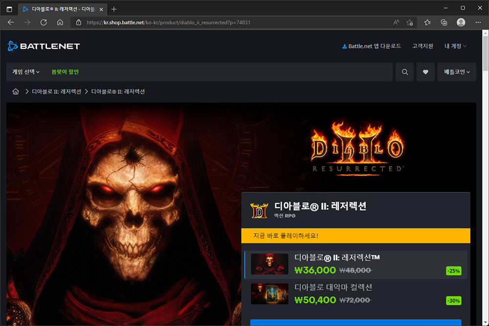 디아블로® II: 레저렉션의 경우에는 36,000원이고 대악마 컬렉션은 50,400원입니다. 출시 초기에 비하면 사용자가 많이 빠져서 조금은 애매한 느낌이 있기는 하지만 여전히 즐기는 분들이 많은 것 같습니다.