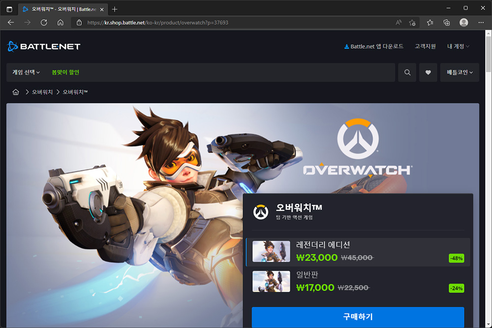 오버워치는 일반 버전과 레전더리 에디션으로 구성되어 있습니다. 각각 17,000원과 23,000원으로 책정되었습니다. 참고로 오버워치2의 경우에는 현재 베타테스트가 진행되고 있는 것 같습니다.
