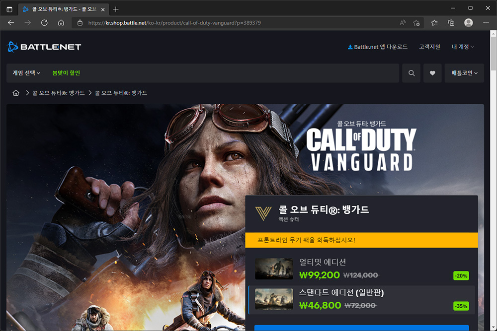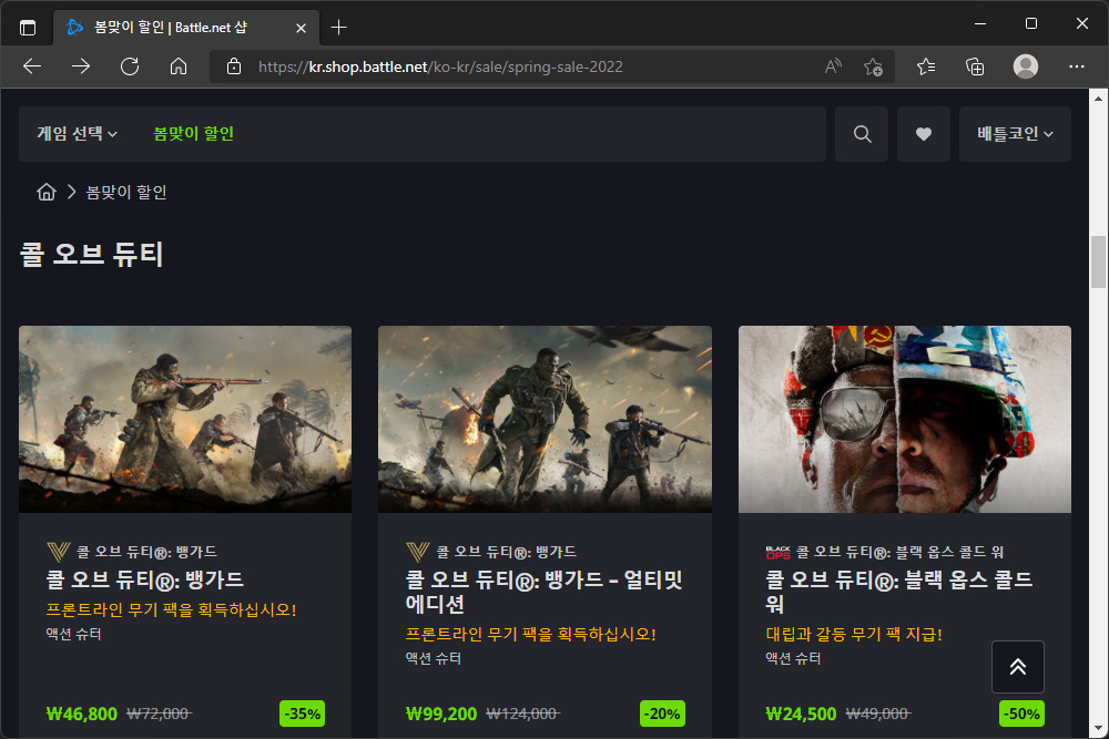 가장 먼저 살펴볼 게임은 콜 오브 듀티 시리즈입니다. 뱅가드와 블랙 옵스 콜드 워 그리고 모던 워페어 등으로 구성되어 있습니다. 할인 가격은 각각 46,800원(뱅가드), 99,200원(뱅가드 – 얼티밋 에디션), 24,500원(블랙 옵스 콜드 워), 22,500원(모던 워페어)입니다. 어디나 그렇듯이 오랜된 게임의 할인율이 높은 편입니다.
