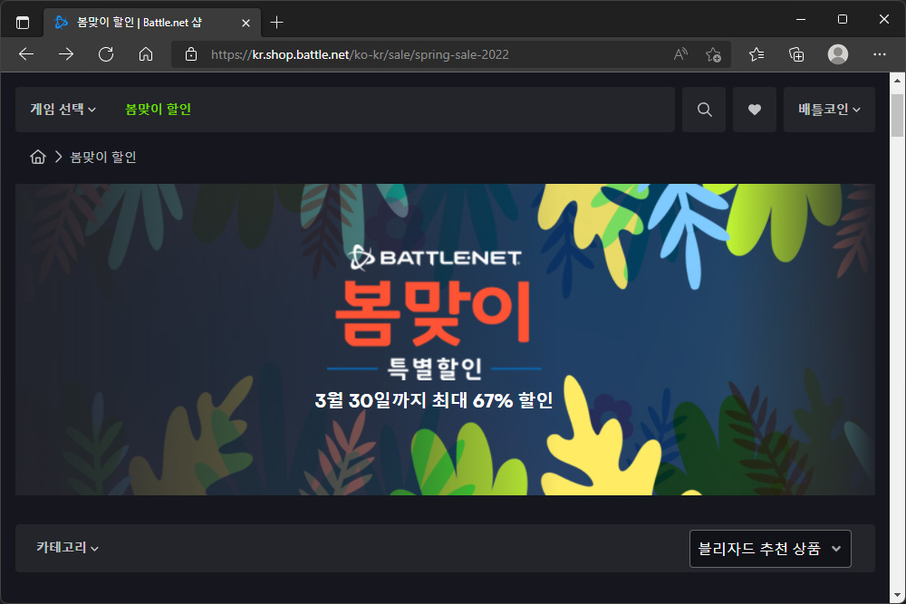 블리자드 배틀넷 봄맞이 특별할인의 경우에는 3월 30일까지 진행될 예정입니다. 기간이 넉넉한 편이어서 충분히 고민한 후에 구매해도 좋을 것 같습니다. 저는 개인적으로 필수 게임들은 구매해 놓는 것을 추천합니다.