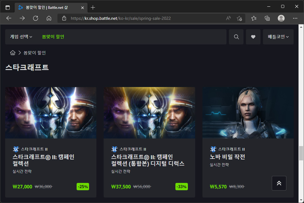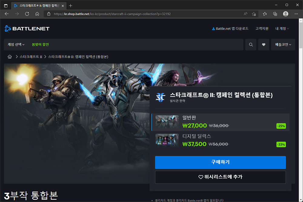 국민 게임이라고 할 수 있는 스타크래프트의 경우에는 1과 2로 구성되어 있습니다. 스타크래프트® II: 캠페인 컬렉션 (통합본)의 경우에는 일반판이 27,000원 디지털 딜럭스가 37,500원으로 구성되어 있습니다. 그리고 스타크래프트®: 리마스터의 경우에는 11,000원이고 카툰 버전은 21,500원입니다.