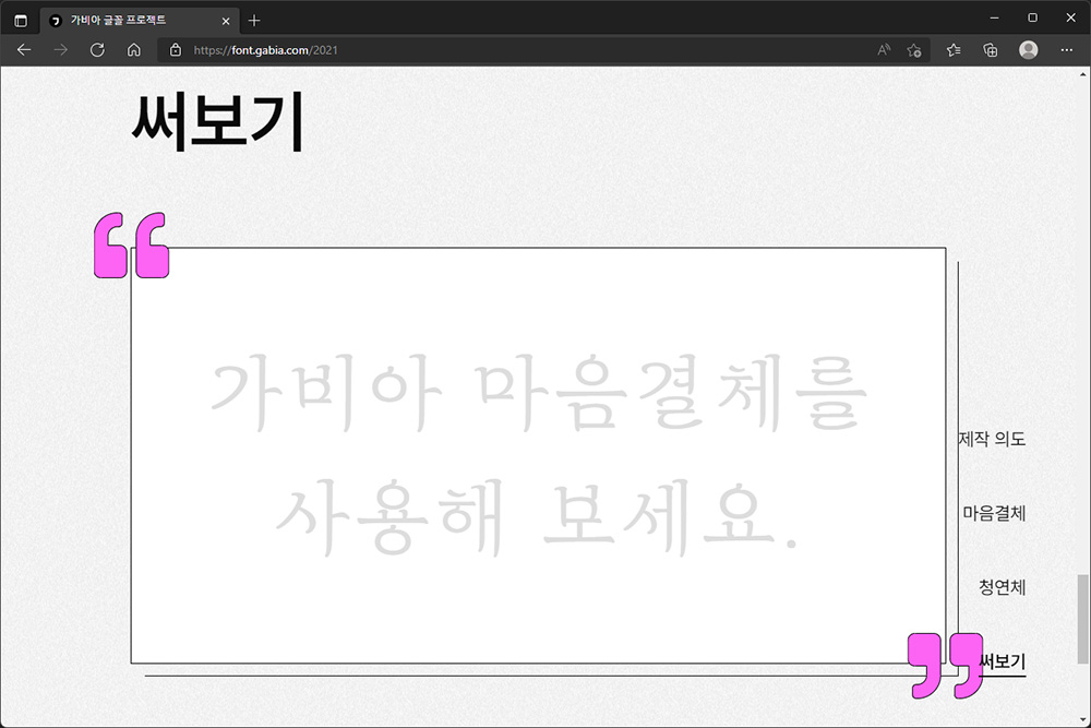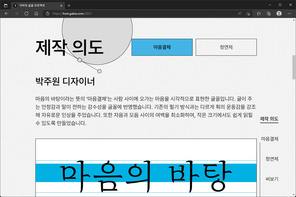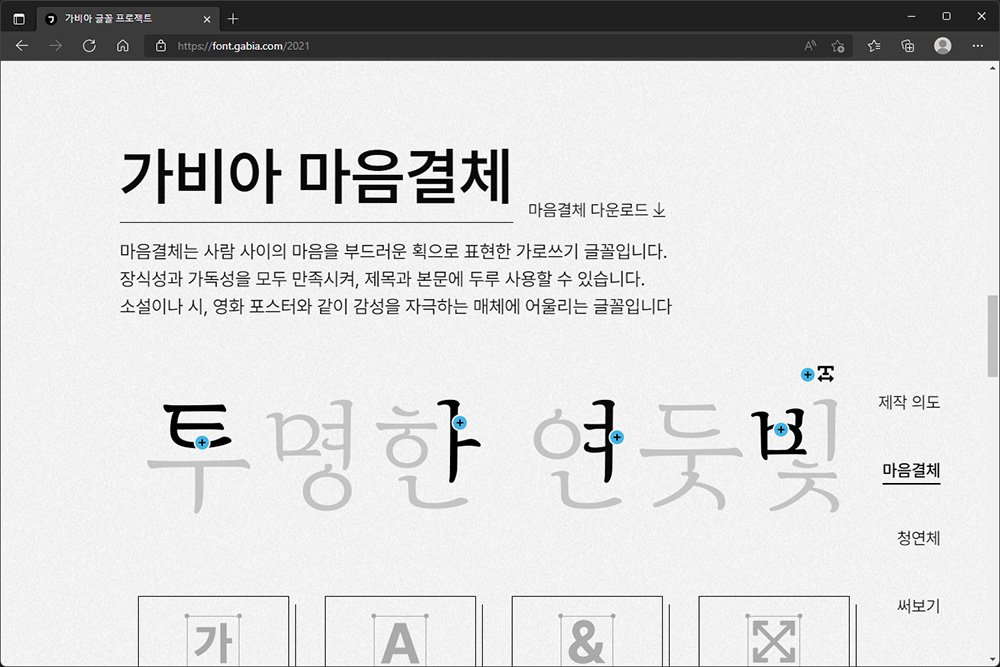 가비아 글꼴 프로젝트 마음결체의 경우에는 박주원 디자이너에 의해서 제작이 되었고 사람 사이에 오가는 마음을 시각적으로 표현을 했다고 합니다. 저는 특히 글꼴의 끝 부분의 표현이 인상적이었습니다.