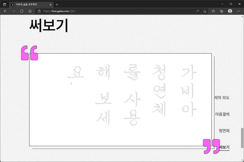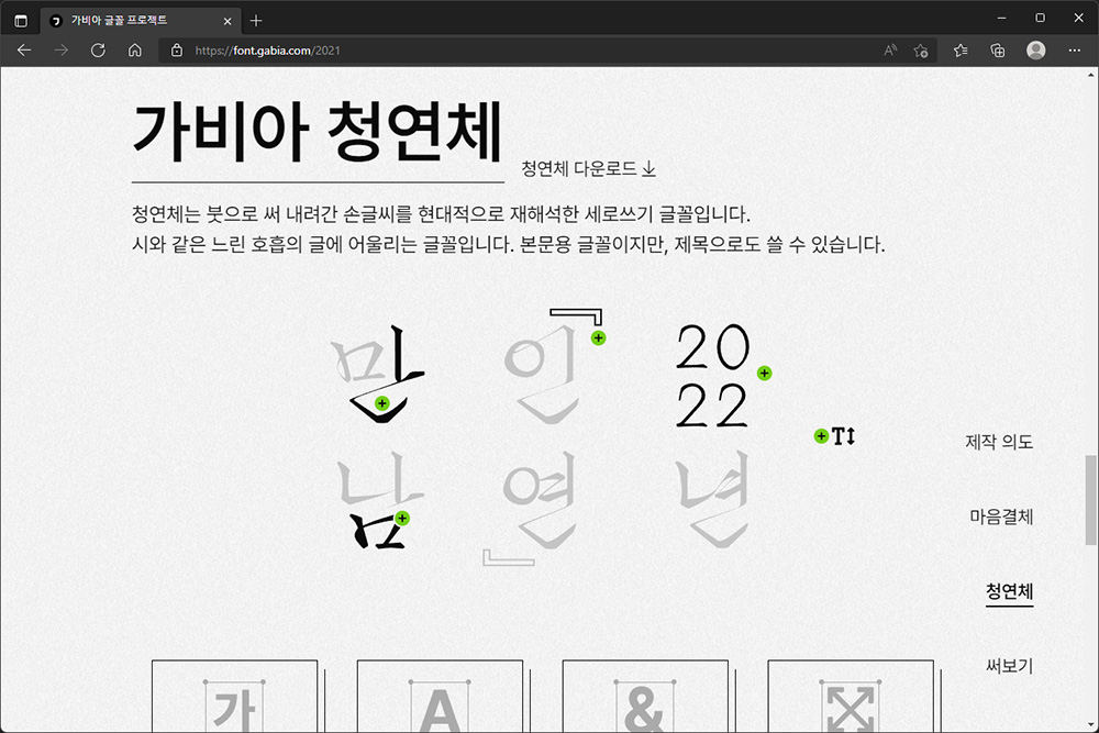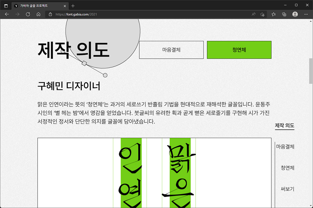 가비아 글꼴 프로젝트 청연체는 구혜민 디자이너에 의해서 제작이 되었고 과거의 세로쓰기 반흘림 기법을 현대적으로 재해석했다고 합니다. 윤동주 시인의 ‘별 헤는 밤’에서 영감을 얻었다고 하는데요. 저는 전체적으로 폰트에 힘이 있는 편이라고 판단되었습니다.
