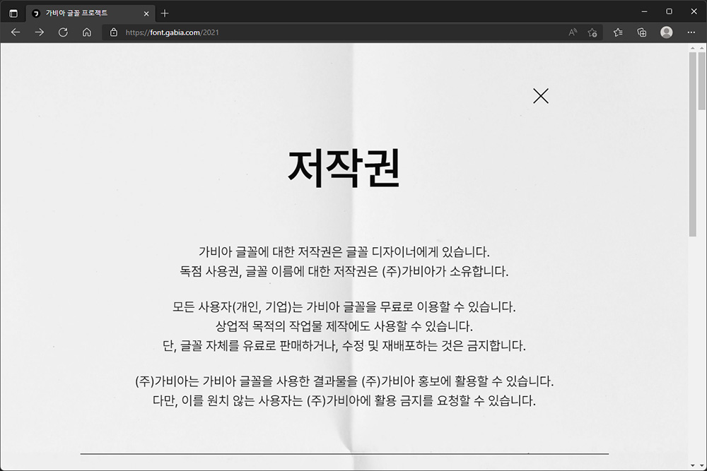 가비아 글꼴 프로젝트의 핵심은 저작권이라고 할 수 있습니다. 저작권은 ㈜가비아가 소유하고 있지만 모든 사용자(개인, 기업)이 무도 무료로 이용할 수 있다는 내용이 표시되어 있습니다.